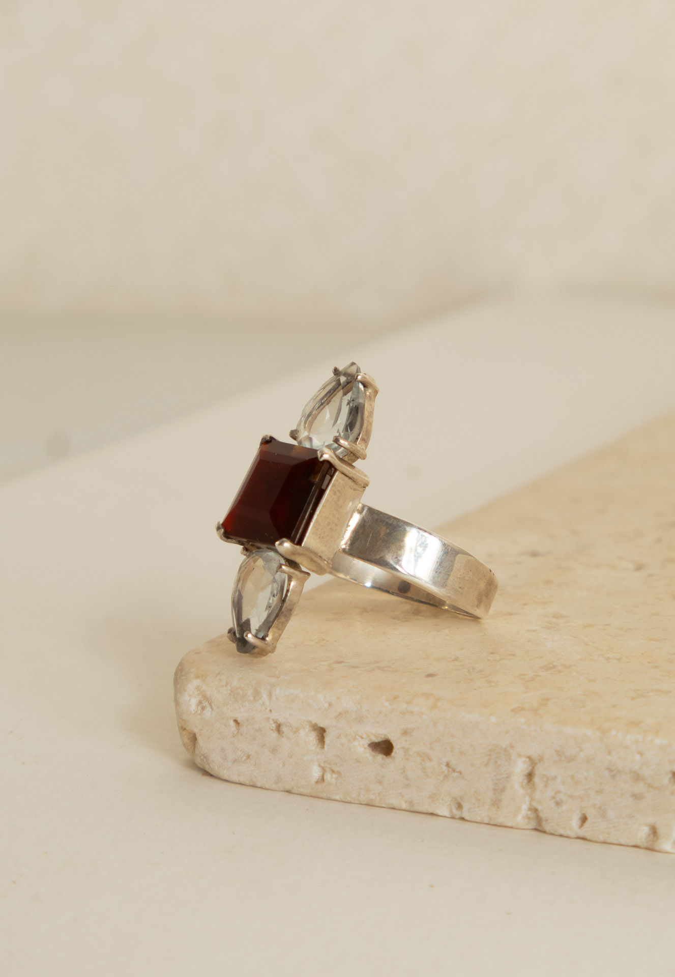 ANEL AUTORAL 3 PEDRAS EM CORNALINA COM TOPÁZIO AZUL NA PRATA 925 ARO 16